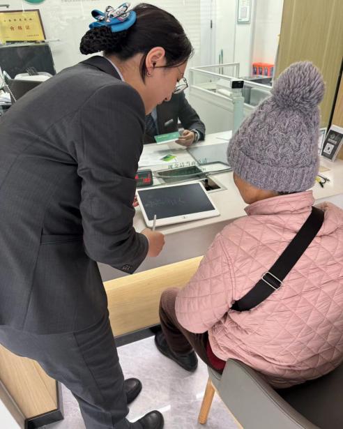 当天,一位头发花白的老人独自走进农行营业厅,值守的员工见状,立即主动上前,面带微笑询问老人业务需求,老人却因听力不佳,无法清晰地听到工作人员的询问,一时间手足无措。员工没有丝毫急躁,而是放慢节奏,逐字逐句写下询问内容,配合手势比划,耐心询问老人的业务需求。办理过程中,从引导老人到柜台、协助填写单据,到反复确认业务信息、指导老人签字确认,每一个环节,员工都格外细心。临走时,老人紧紧握住员工的手,脸上露出了欣慰的笑容,用简单的手势向员工表达感谢,眼神里满是感激与认可。